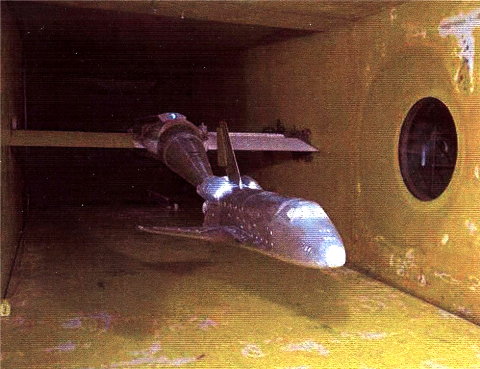 写真右側よりピストンが発射され、秒速7km、温度1,000度、圧力1,500気圧の空気流を発生させる。持続時間3/1,000秒程度